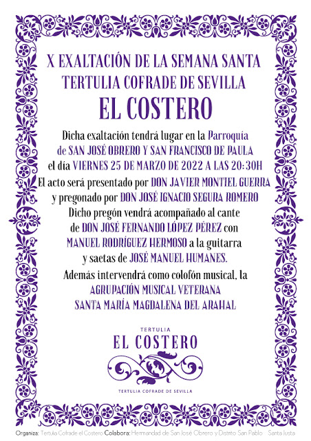 Desde esta tertulia cofrade de Sevilla queremos dar la noticia de la elección del pregonero de la XI Exaltación de la Semana Santa Tertulia Cofrade de Sevilla El Costero.